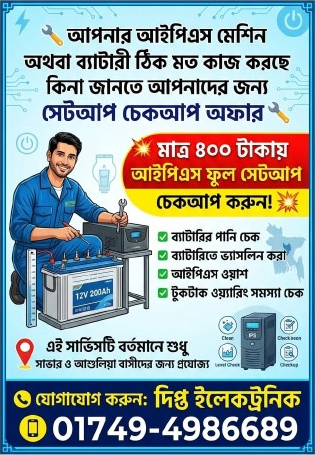 বিদ্যুৎ সমস্যা, IPS বা Solar System নিয়ে প্রশ্ন, ব্যাটারি সংক্রান্ত যেকোনো সমস্যায় আর চিন্তা নয়। 💡 আমাদের অভিজ্ঞ টেকনিশিয়ান টিম দ্রুত আপনার সমস্যার সমাধান দিতে প্রস্তুত।