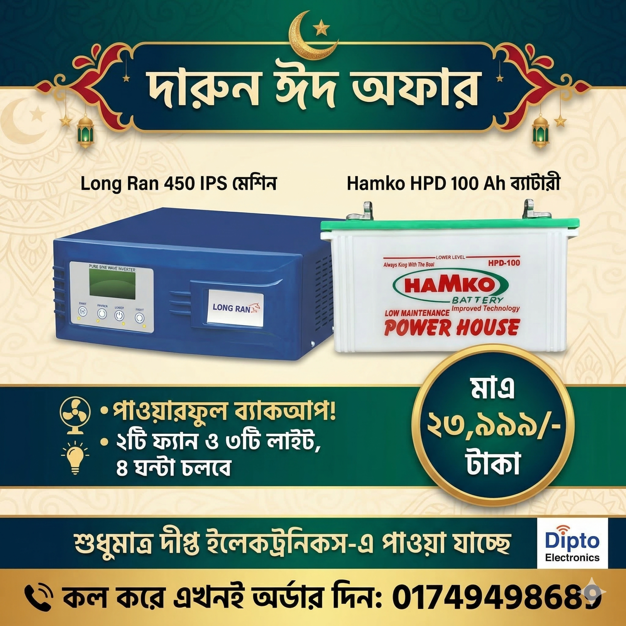 Long Ran 450 IPS (2 years Warranty) āĻāĻŦāĻ Hamko HPD 100Ah āĻŦā§āϝāĻžāĻāĻžāϰāĻŋ (18 Month Warranty)